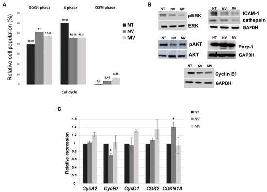 Grapefruit-derived vesicles induce cell cycle arrest and affect the expression of oncogenes and cell-cycle regulatory genes in melanoma cells (A) Flow cytometry analysis of melanoma A375 cells untreated (NT) or treated with 25 μg/mL nanovesicles (NVs) or microvesicles (MVs) for 24 h. Cell distribution in the different cell cycle phases was determined by propidium iodide staining. Each point represents the mean ± SD of three independent experiments. (B) Western blot analyses were performed on cells treated for 24 h with 25 μg/mL of C. paradisi-derived nanovesicles or microvesicles. Levels of proteins involved in cell proliferation (pERK and pAkt), oncogenes (ICAM 1 and cathepsin) and apoptosis (Parp-1) were evaluated. Blots were stripped and subsequently re-probed with an antibody against GAPDH to check equal loading of protein extracts. (C) Relative expression levels of cell-cycle regulatory genes in 24 h NV- and MV-treated melanoma cells by qRT-PCR. GAPDH was used as a reference gene to normalize the expression levels. Data represent mean ± SD of three technical repeats from three biological replicates, expressed as relative fold changes compared to their basal level in untreated A375 cells. Statistically significant values in untreated A375 cells assessed by t-test (* p ≤ 0.05).