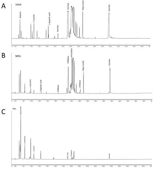 Polar metabolites from juice, MVs and NVs samples isolated from grapefruit were extracted by chloroform/methanol/water partitioning using phase separation and analysed by GC-MS to reveal metabolome profiles. GC-MS is a highly sensitive and high-throughput analytical technique, useful for targeted and untargeted studies of metabolites in plants. Here, we performed an untargeted GC-MS study to analyze and tentatively identify the extracted metabolites and to obtain the concentration profiles. More than 100 peaks were detected in each sample of juice and MVs and about 80 in NVs from which about one third were tentatively identified by spectral matching in the NIST reference library (Table S2). Typical GC-MS profiles obtained by full scan mode are shown in Figure 3.