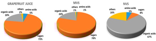 Figure 4 shows how the common classes of organic compounds, i.e., amino acids and derivatives, carbohydrates and derivatives, organic acids and other metabolites are distributed in the three kinds of samples. Based on this, NVs have a considerably different metabolome profile then whole juice and MVs, while MVs and whole juice are similar to each other. In contrast to the characteristically high sugar content observed in juice (73%) and MVs (78%), NV are characterized by the presence high relative amount of organic acids (67%). Highly expressed organic acids in NVs were alpha-hydroxy acids (AHAs) represented by mainly glycolic and citric acids. Regarding amino acids, while in the juice we could detect a broad range of amino acids including asparagine, aspartic acid, alanine, glutamic acid, leucine, proline, threonine, valine, serine, etc., the amino acid content of MVs and NVs is restricted prevalently to leucine/isoleucine and aspartic acid, this later is present only in MVs (Table S2). Notably, grapefruit-derived MVs contain also aucubin, an iridoid glycoside which is shown to have a variety of pharmacological effects including antimicrobial and anti-inflammatory effects [].