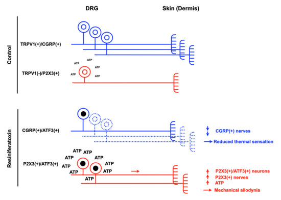 - Hsieh, Y.L.; Chiang, H.; Lue, J.H.; Hsieh, S.T. P2X3-mediated peripheral sensitization of neuropathic pain in resiniferatoxin-induced neuropathy. Exp. Neurol. 2012, 235, 316–325. [Google Scholar] [CrossRef]