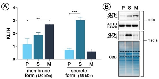 This study is a follow-up project using the same model of monocytes stable overexpressing membrane (mKL-pDNA) and secrete (sKL-pDNA) form of klotho as described previously []. However, here we used a new batch of cells obtained from EACC and decided to present results of Western Blot supporting the good efficiency of transfection. As can be seen in Figure 1, the expression of membrane form of klotho with a molecular weight of 130 kDa increased by 2.32-fold (p < 0.01) in mKL-pDNA cells when compared to cells transfected with the control plasmid (vector cells). Simultaneously, the level of klotho secreted into cell culture media (65 kDa) by sKL-pDNA cells increased by 4.26-fold (p < 0.001) when compared to vector cells (Figure 1).