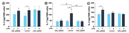 Finally, we decided to control whether the state of Golgi stress affects the secretion of proinflammatory cytokines, which final modification, glycosylation, and packaging take place in the Golgi apparatus. LPS treatment resulted in a 1.51-fold increase in the secretion of IL-2 in vector cells (p < 0.05) with slight but not statistically significant effect in sKL-pDNA (Figure 5A). A 2.36-fold (p < 0.05) enhancement in the level of IL-7 was also observed in vector cells stimulated with LPS. Moreover, the levels of IL-7 were downregulated by 54.5%in sKL-pDNA (p < 0.01) and 60.3% in mKL-pDNA cells (p < 0.01) after LPS activation when compared to vector cells (Figure 5B). The level of third analyzed interleukin, i.e., IL-3, was affected only in sKL-pDNA cells after stimulation with LPS and a 1.35-fold increase was reported (p < 0.05; Figure 6C).