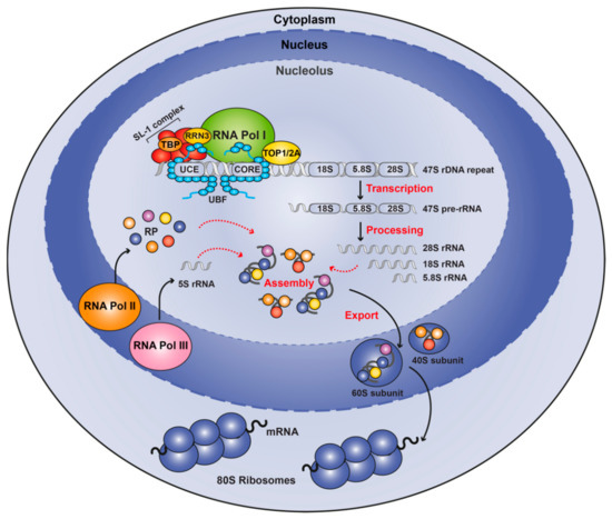 Within the nucleolus, the 47S transcript is processed into mature 18S, 5.8S and 28S rRNA that associate with the 5S rRNA and the RPs, and the resultant 40S and 60S are subsequently exported from the nucleolus to the cytoplasm where maturation is completed generating the functional ribosome [40].