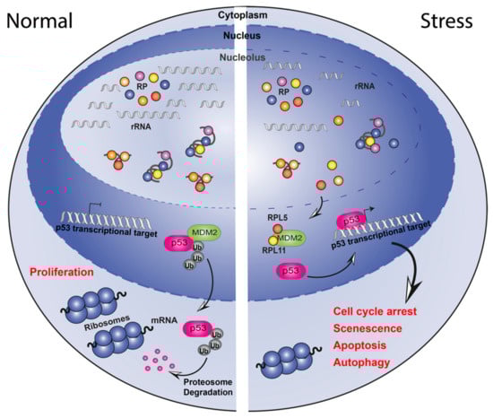 Schematic representation of the nucleolar surveillance pathway. Under normal growth conditions (left), ribosomal proteins (RPs) are assembled with ribosomal RNA into the 40S and 60S subunits in the nucleolus. p53 activity is maintained at low levels by ubiquitin-mediated degradation induced by MDM2. Following nucleolar stress (right), ribosome biogenesis is halted thus RPs, rRNAs, and other nucleolar proteins are released into the nucleoplasm. RPL5 and RPL11 are free to bind to MDM2 and prevent p53 ubiquitylation. p53 is then available for regulation of its target genes leading to cellular responses like cell cycle arrest, senescence, apoptosis and autophagy.