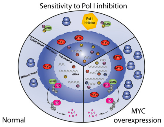 The expression level of the oncoprotein MYC (cMYC and N-MYC) is another potential biomarker to predict therapeutic response to Pol I transcription inhibitors. MYC expression is deregulated in a large proportion of cancers and its overexpression is linked with poor prognosis [99,100]. Through its function as a transcription factor MYC can directly regulate the expression of multiple genes involved in cell growth and division thus, impacting on a variety of processes including cell cycle regulation, protein synthesis and metabolism [101,102,103]. Recent experimental evidence supports a model whereby MYC is responsible for the global amplification of genes already expressed in normal cells rather than inducing new gene expression signatures [104,105]. Cancer cells become addicted to high levels of MYC to sustain their growth and therefore, are very sensitive to direct or indirect perturbation of MYC levels leading to proliferative arrest, differentiation or apoptosis [106]. MYC regulates RiBi by directly targeting protein-coding genes involved in RiBi, like UBF [13,107,108], RP and auxiliary proteins [109], as well as by activating Pol I- and Pol III- dependent transcription of 47S pre-rRNA and 5S rRNA respectively [83,107,108,110]. Consistent with the above, MYC-driven cancers have significantly increased levels of RiBi compared to non MYC-driven cells of the same lineage and are in general highly sensitive to Pol I transcription inhibitors [44]. One explanation for this heightened sensitivity of MYC-driven tumours to Pol I transcription inhibition is the ability of MYC to sensitise cells to NSP. In this paradigm MYC drives both rRNA synthesis and RP synthesis. Inhibition of rRNA synthesis by Pol I transcription inhibitors results in a massive excess of RPs, including RPL5 and RPL11 which in the absence of rRNA bind MDM2 and prevent the degradation of p53 leading to severe and prolonged activation of NSP and increased death of malignant cells compared to non MYC-driven malignancies (Figure 5). This is supported by the report that the level of p53 stabilization is dependent on the rate of ribosomal synthesis [111] and animal models of MYC-driven cancer respond well to treatment with CX-5461 [44,88]. Intriguingly, in MYC driven lymphomas, RiBi is in excess of requirements for the accelerated proliferation as rescuing apoptotic cell death induce by a 30–40% reduction by Pol I transcription inhibition restores a normal proliferative rate. This observation leads to the intriguing hypothesis that MYC has evolved to drive rRNA synthesis, not only to fuel growth and proliferation but to suppress p53 by ensuring RPs are consumed by rRNA during the processing stage of RiBi and are not available to bind MDM2 to suppress p53. This ensures that p53 is off when MYC is on and vice-versa.