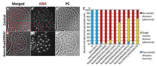 As most of the Nups are well-conserved in Drosophila, we decided to investigate the role of the NPC in spermatogenesis using this model animal that allows well-advanced genetic analyses [,,]. A previous study using spermatocyte-specific RNAi experiments investigated whether the depletion of the 30 Nups affected the progression of premeiotic cells through meiosis []. The authors reported that the depletion of all three members of the Nup62 complex, but not of other Nups, resulted in the absence of meiotic cysts in their testes. However, the mechanism underlying the absence of meiotic cells in testes depleted of the Nup62 complex is not known. Drosophila spermatogenesis commences from the unequal division of germline stem cells localized at the tip of the testis. After four rounds of mitosis of the spermatogonium, one of the two daughter cells of the stem cells differentiate, and the resultant 16 cells form a single cell unit called the cyst. Every spermatocyte in a cyst undergoes cell growth synchronously, and subsequently they initiate the first meiotic division at the same time. Consequently, 32 cells are generated after the completion of the first meiotic division. Finally, 64 post-meiotic cells called spermatids are made in the cyst [,,,]. Whether meiotic divisions have been performed twice, once, or not even once can be judged by counting the number of post-meiotic cells present in a spermatid cyst.