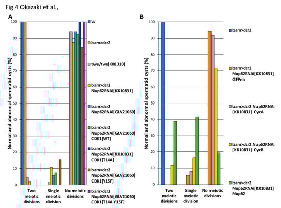 The following are available online at https://www.mdpi.com/2073-4409/9/2/270/s1, Figure S1: qRT-PCR experiments to confirm that UAS-RNAi stocks used in this study can deplete the relevant mRNAs efficiently, Figure S2: Immunostaining of premeiotic spermatocytes to confirm that Nup54, another component of Nup62 complex is not localized on nuclear envelope in the Nup62-depleted spermatocytes, Figure S3: Intact cysts consisted of early spermatocytes generated from mitoses of spermatogonia and those of post-meiotic cells derived from spermatocytes depleted of Nup62.