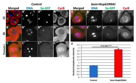 To understand whether the expression of CycB and/or its cellular localization is perturbed in the Nup62-depleted premeiotic spermatocytes, we performed immunostaining of the spermatocytes with anti-CycB antibody (Figure 5). CycB accumulated in the cytoplasm in normal spermatocytes in the S5 stage with distinct Sa-GFP foci on nucleoli (Figure 5(A,A”’)). Judging from previous studies using mammalian cells, this is a consequence of nuclear export of the CycB. Subsequently, the highest amount of the protein was observed in the cytoplasm in the S6 stage, in which the size of the Sa-GFP foci had diminished (Figure 5B). CycB became to be accumulated in the nuclei after the Sa foci disappeared at prophase I (Figure 5C). We compared the intracellular localization of CycB in normal spermatocytes with that in the Nup62-depleted spermatocytes in the same stages, as was evident from the Sa-GFP signal. Lesser immunofluorescence was observed in the cytoplasm of the Nup62-depleted spermatocytes in the S5 stage than in normal spermatocytes in the same stage. Accumulation of CycB into the nucleus occurs in premeiotic spermatocytes depleted of Nup62 in the earlier S5 stage, as was evident from the remaining apparent Sa-GFP foci (Figure 5D). The nuclear accumulation of CycB was observed in premeiotic spermatocytes in the S6 stage, in which decrease in Sa-GFP foci was observed (Figure 5E,F). Large amounts of CycB did not accumulate in prophase I spermatocytes in the depleted testes.