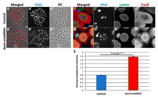 Hence, we performed immunostaining of the emb-depleted premeiotic spermatocytes with anti-CycB antibody (Figure 6C,D). Anti-CycB fluorescence was higher in the cytoplasm than in the nucleus in control spermatocytes (bam>dcr2) until the S5 stage before meiosis (Figure 6C). The ratio of the immunofluorescence intensity of CycB in the nucleus to that in the cytoplasm was calculated to be 0.8 in normal spermatocytes (Figure 6E). In contrast, a considerable amount of the protein had already entered the nuclei of the Emb-depleted spermatocytes (bam>embRNAiHMS00991) (Figure 6D). The average ratio of the anti-CycB immunofluorescence in the nucleus to that in the cytoplasm in the emb-depleted cells was 1.8 (Figure 6E), which was significantly higher than that in the control (bam>dcr2). Consequently, sufficient cytoplasmic accumulation of CycB was not observed (Figure 6(D”’)). Taken together, Emb is also required for the export of CycB that has temporally entered the nucleus temporally before meiosis.