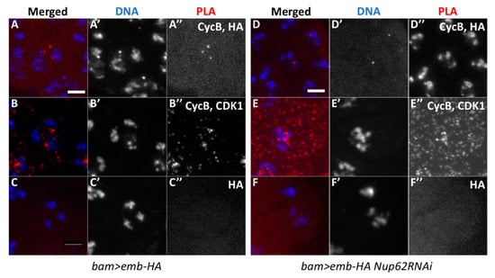 Proximity ligation assay (in situ PLA) showing close association between Emb and CycB in normal premeiotic spermatocytes and Nup62-depleted cells before initiation of meiosis I. (A–F) In situ PLA of premeiotic spermatocytes for detecting protein complexes. The PLA foci are in red (A–F) and white (A”–F”). (A) The PLA foci with anti-CycB and anti-HA antibodies indicate the presence of protein complexes containing CycB and Emb-HA in normal spermatocytes expressing Emb-HA. (B) A positive control of the assay with anti-CycB and anti-CDK1 antibodies. (C) A negative control for in situ PLA with anti-HA antibody alone (0.31%, n = 318). (D–F) In situ PLA of the spermatocytes with Emb-HA expression and depletion of Nup62. (D) Assay with anti-CycB and anti-HA antibodies; 20.3% of the Nup62-depleted cells contained the PLA foci, indicating presence of protein complexes containing CycB and Emb (n = 320). (E) A positive control experiment with anti-CycB and anti-CDK1 antibodies (99.4%, n = 167). (F) A negative control experiment with only anti-CycB antibody (1.1%, n = 184). Blue; DAPI staining.