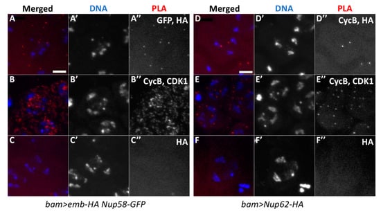 In situ PLA that enables detection of protein interaction within a cell was performed according to the Duolink kit method (Nacalai Inc., Kyoto, Japan). We applied the in situ PLA method to examine a close association between three sets of proteins, Emb and CycB, Emb and Nup58, and Nup62 and CycB. For the detection of complexes containing the first protein set, we used anti-HA and anti-CycB antibodies to recognize complexes containing Emb-HA and Cyclin B. We used anti-HA and anti-GFP antibodies to detect complexes containing Emb-HA and Nup58-GFP. We used anti-HA and anti-CycB antibodies to recognize complexes containing Nup62-HA and CycB. We observed a positive control of in situ PLA signals indicating association between CycB and CDK1 using the relevant antibodies. Samples were observed with a fluorescent microscope (Olympus, Tokyo, Japan, model: IX81). Image acquisition was controlled through the Metamorph software version 7.6 (Molecular Devices) and processed with ImageJ version 1.51 or Adobe Photoshop CS4.
