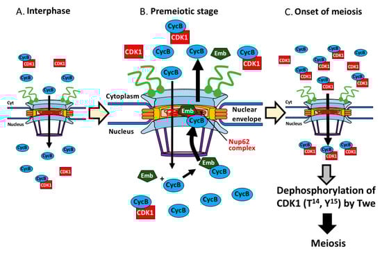In this study, we confirmed that a spermatocyte-specific depletion of all the members of the Nup62 complex, namely, Nup54, Nup58, and Nup62, resulted in the cell cycle arrest of premeiotic cells before the first meiotic division. Immunostaining demonstrated that the failure of meiotic entry resulted from the inhibition of CDK1 activation in cells prior to meiosis. As genetic evidence indicated that phosphorylation and dephosphorylation of CDK1 were not involved in cell cycle arrest, we investigated the cellular localization of CycB. Consequently, we observed that the regulatory subunit for CDK1 remained to be accumulated in the nuclei of the premeiotic cells. These observations suggested that absence of active CDK1 in Nup62-depleted cells resulted from abnormal localization of the complex, which is responsible for the failed nuclear export of the protein. We showed that a Drosophila CRM1 orthologue encoded by emb is required for CycB export. We further observed temporal protein complexes containing CycB, Emb, and Nup62 in the premeiotic cells. Overall, we proposed that selective export of CycB through the NPC is required to initiate male meiosis in Drosophila spermatogenesis.