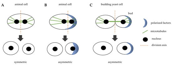 In most cases, cell division is carried out thanks to a cleavage that occurs in the middle of the mother cell, perpendicularly to the axis of chromosome segregation to allow for equal division of the genetic material. This process leads to an equal partition of the cytoplasm and it is called “symmetric cell division” (Figure 1A). After anaphase onset, the position of the spindle allows for the assembly of a cleavage furrow that specifies the division plane. This plane is defined by different types of signals, activating and inhibitory, from aster microtubules (MTs) to the cortex and from the spindle midzone to the equator. There is evidence that a negative signal is also generated at the poles for inhibiting cleavage furrow formation [].