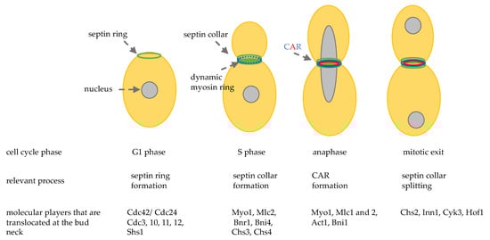The bud neck is the site that separates the mother cell from the daughter cell, it is not only a spatial point, but it has a very complex structure (Figure 2). In late G1, the first recruited proteins are septins: 5 GTP-binding proteins (Cdc3, Cdc10, Cdc11, Cdc12, and Shs1) that form linear apolar filaments that assemble into 3D structures that are highly dynamic during mitosis []. Septins filaments associate with the cell membrane and they form a ring around the bud neck during bud emergence and their function is essential in maintaining bud neck structure. During the progression of the cell cycle, the septin ring changes its shape becoming a rigid hourglass structure, and then splitting into two rings at the final steps of cytokinesis []. Septins rearrangements are regulated by protein-protein interactions and by phosphorylation/dephosphorylation and sumoylation events []. Septin ring acts as a platform for other proteins and a signaling landmark for actin cytoskeleton filaments that drive mitotic spindle positioning and orientation. In addition, several protein kinases that are important for cell cycle progression and cell cycle chekpoints are associated with septins and their localization at the bud neck depends on septins []. It is important to point out that septins also act as a cortical barrier to block movement of membrane proteins thus helping to build cellular compartmentalization [].