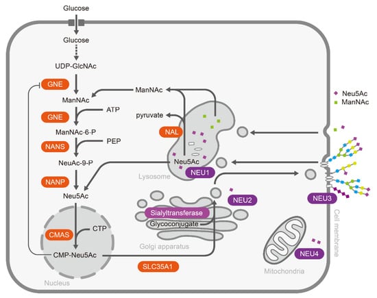 In general, sialic acids normally exist as the terminal sugars in the periphery of oligosaccharides via different glycosidic linkages (α2,3, α2,6 α2,8, and α2,9) [7]. Polysialic acid (PSA), a linear homopolymer of sialic acids mainly in α-2,8 and/or α-2,9 linkages, is usually attached to glycoproteins, such as the neural cell adhesion molecule (NCAM) [8,9]. Sialic acid metabolic pathways include the cooperation of certain enzymes that catalyze the biosynthesis, activation, and transfer of sialic acids to glycoconjugates, as well as the removal and degradation of sialic acids (Figure 1) [10]. In the human body, sialic acid biosynthesis starts at UDP-GlcNAc in the cytosol. Primitively, sialic acid synthesis is catalyzed by UDP-GlcNAc 2-epimerase/ManNAc-6-kinase (GNE), converting UDP-GlcNAc to ManNAc-6-P [11,12]. Next, ManNAc-6-P is transformed to Neu5Ac by Neu5Ac 9-phosphate synthase (NANS) with phosphoenolpyruvate (PEP) and Neu5Ac-9-phosphate phosphatase (NANP) [13,14]. Finally, Neu5Ac synthesized in cytosol is transferred to the nucleus and activated by the cytosine 5′-monophosphate N-acetylneuraminic acid synthetase (CMAS) to form CMP-Neu5Ac [15].