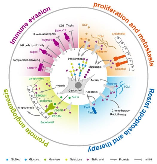 Sialic acids affect cell apoptosis mainly through two pathways, the Fas receptor-Fas ligand (FasR-FasL) apoptotic pathway and anoikis. FasR-FasL interaction, induced through activated T cells and mediated by caspase activation, is important for homeostasis of cells in the immune system and for immune-privileged site maintenance in the human body [84]. Sialylated FasR blocked the binding of Fas-associated adaptor molecules to the FasR death domain, thus inhibiting the formation of the death-inducing signaling complex [85]. Sialyltransferase ST6GAL1 was found to elevate α2,6-sialylation on FasR to inhibit the apoptotic signaling in colon carcinoma cells [85]. Moreover, α2,6-sialylation impaired internalization of the Fas receptor and prevented further positive feedback loops for Fas-mediated apoptosis [86]. Anoikis is another cell death pathway induced by cell detachment from extracellular matrix (ECM). It is a vital mechanism in preventing adherent-independent cell growth and attachment to an inappropriate matrix [87]. Cancer cells showed a higher degree of anoikis resistance than the normal intestinal epithelial cells [88,89]. Integrin-mediated cell-ECM interactions are functionally involved in regulating tumor angiogenic response during cancer metastasis. The loss of integrin-mediated epithelial cell-ECM interactions decreases the phosphorylation of down streaming effectors such as FAK, PI3-K, ERK1, and MAP kinases, thus mediating cell susceptibility to anoikis [90]. However, α2,6-hypersialylation of fibronectin receptor integrin α5β1 could avoid anoikis by preventing galectin-1 binding to integrins [91,92]. On the other hand, α2,6-sialylation showed vital effects on therapeutic resistance in many cancers [93,94,95], possibly through the sialylated receptors such as EGFR [96,97,98]. EGFR sialylation was reported to suppress its dimerization and to induce phosphorylation, reducing the effects of tyrosine kinase inhibitors [98].