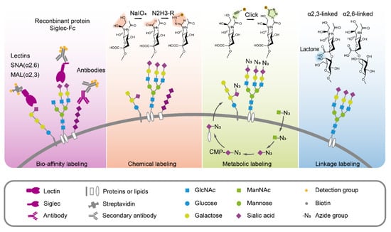 Over the past decade, several bio-affinity-based approaches for directly detecting sialic acids and sialylglycans have been developed, including lectins, antibodies, and recombinant sialic acid-binding proteins [115]. Lectins are sugar-binding proteins that can specifically recognize glycans on glycoconjugates. Sambucus nigra lectin (SNA) and Maackia amurensis lectin (MAL) are commonly used to recognize the α2,6-linked and α2,3-linked sialic acid residues, respectively [116,117,118], in lectin blot [119], lectin microarray [120,121,122], histochemistry [123], fluorescent image and flow cytometry [56,124]. Using lectin MAL-1, α2,3-linked sialic acids were found to promote gastric cancer cell metastasis [125]. Detecting sialic acids using antibodies is a routine strategy. However, antibodies against sialic acid are normally generated from carbohydrate antigens, and are usually immunoglobulin M (IgM) with low binding affinity. Antibodies only exhibited better affinity for polysialic acid with long-chain polymer [110]. Thus, antibodies are not widely used for detecting sialic acids [115]. Alternatively, the sialic acid receptors fused with tags or fluorescent protein have also been used in sialic acid detection. For example, Siglecs fused with the Fc portion of human IgG1 (Siglecs-Fc) were applied to the detection of sialylglycans [126]. Those methods provided a simple way to directly detect and visualize sialic acids in cells or tissues and to better understand the relationship between sialic acids and tumor progression.