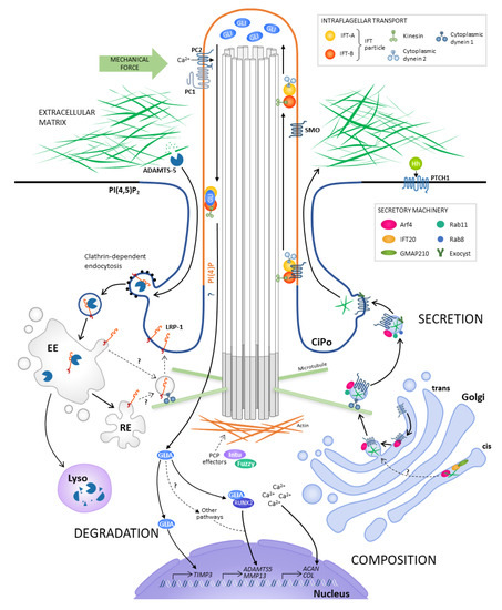 Another crucial process involved in the maintenance of ECM homeostasis is the degradation of matrix macromolecules in response to changes in the extracellular environment. For example, this process is essential in the migration of cells and remodelling in response to mechanical loads, enabling adaptation of the mechanical properties of the tissue. The main mechanism by which matrix components are degraded is through the actions of proteases, specifically metalloproteinases. The cilium and periciliary membrane domain have been linked to the regulation of the expression and activity of these enzymes in a number of ways, as discussed below.
