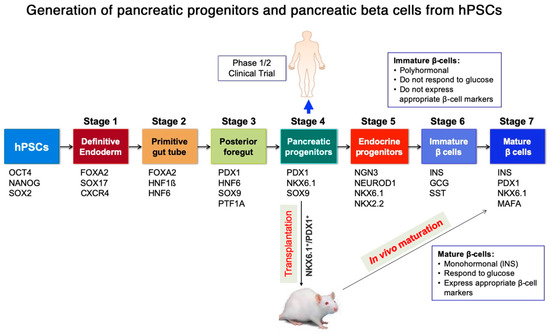 Different stages of pancreatic beta cell development during the differentiation process. According to Rezania et al. protocol the differentiation of hPSCs into pancreatic beta cells occurs though their differentiation into seven stages, which are confirmed by examining stage-specific markers [8]. Stage 4 (pancreatic progenitors) co-expressing PDX1 and NKX6.1 (PDX1+/NKX6.1+) is currently used in clinical trial for diabetes treatment. PDX1+/NKX6.1+ cells transplanted into mouse model can differentiate in vivo into mature insulin-secreting cells. Furthermore, mature beta cell stage generated in vitro can be directly transplanted into mouse model.