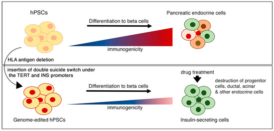 Immuno-modulation strategies for ‘off-the-shelf’ clinical use of human pluripotent stem cell-derived beta cells. A universal product can be developed by combining gene editing for different strategies, such as HLA antigen disruption to reduce immunogenicity and insertion of double suicide switches to eliminate proliferative, non-committed progenitors as well as other pancreatic lineages, thereby enriching insulin-secreting beta cells.