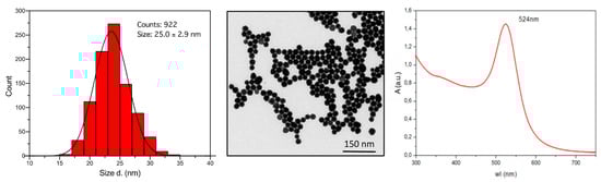 Characterization of 25 nm AuNP. Size distribution profile (left panel), STEM image (central panel), and UV-Vis profile (right panel) of AuNP following synthesis.