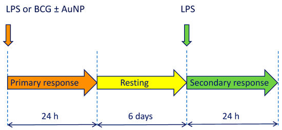Schematic depiction of the in vitro model of innate immune memory. Primary activation was induced by stimulation for 24 h with LPS or BCG, in the absence or in the presence of AuNP. Supernatants were collected and cells rested for six days. On day 7, a secondary response was induced by challenge with LPS for 24 h (control groups were challenged with medium alone), after which supernatants were collected for evaluation of cytokine production.