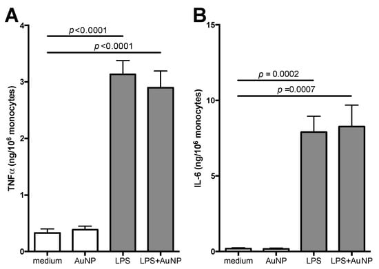 Primary response of human monocytes to LPS and AuNP. CD14+ monocytes were exposed for 24 h to LPS (1 ng/mL) in the absence or in the presence of AuNP (10 μg/mL). Release of TNFα (A) and IL-6 (B) was measured in the supernatants. Results are reported as mean ± SEM of data from 4 individual donors, tested in four separate experiments. p values are indicated when p < 0.05. Although statistically significant, we have not reported in the figure the differences between AuNP and LPS (p < 0.0001 for TNFα, and p = 0.0002 for IL-6) or between AuNP and LPS + AuNP (p < 0.0001 for TNFα, and p = 0.0007 for IL-6).