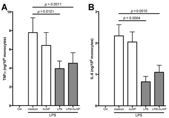 Secondary response of human monocytes primed with LPS and AuNP. Following primary activation (in x-axis: medium, AuNP, LPS, LPS + AuNP), cells were rested for six days and then challenged with LPS (5 ng/mL) for 24 h. Supernatants were tested for TNFα (A) and IL-6 (B). Ctrl represents the response of cells challenged with medium (the lack of response was identical in cells previously primed with medium, AuNP, LPS, or LPS + AuNP). Results are reported as mean ± SEM of data from 4 individual donors, tested in four separate experiments. Further, p values are indicated when p < 0.05. Although statistically significant, we have not reported in the figure the differences between AuNP and LPS (p = 0.0203 for TNFα, and p = 0.0009 for IL-6) or between AuNP and LPS + AuNP (p = 0.0491 for TNFα, and p = 0.0011 for IL-6).