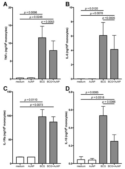 Primary response of human monocytes to BCG and AuNP. CD14+ monocytes were exposed for 24 h to BCG (MOI = 1) in the absence or in the presence of AuNP (10 μg/mL). Release of TNFα (A), IL-6 (B), IL-1Ra (C) and IL-10 (D) was measured in the supernatants. Results are reported as mean ± SEM of data from 2–4 individual donors tested in separate experiments. p values are indicated when p < 0.05. Although statistically significant, we have not reported in the figure the differences between AuNP and BCG (p = 0.0096 for TNFα, p = 0.0120 for IL-6, p = 0.0104 for IL-1Ra, and p = 0.0099 for IL-10) or between AuNP and BCG + AuNP (p = 0.0249 for TNFα, p = 0.0078 for IL-6, p = 0.0067 for IL-1Ra, and p = 0.0498 for IL-10).
