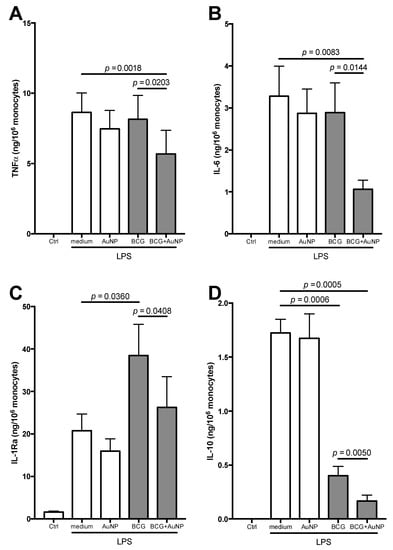 Freshly isolated monocytes were suspended in culture medium (RPMI 1640 + Glutamax-I; GIBCO by Life Technologies, Paisley, UK) supplemented (unless otherwise noted) with 50 µg/mL gentamicin sulfate (GIBCO), and 1 × 105 cells/well were seeded in 96-well flat bottom plates (Corning® Costar®; Corning Inc. Life Sciences, Oneonta, NY, USA). For primary stimulation, monocytes were incubated, in a final volume of 0.2 mL, with culture medium (negative control), AuNP (10 µg/mL), LPS (1 ng/mL; from E. coli O55:B5; Sigma-Aldrich, Inc.), live BCG (Mycobacterium bovis BCG Moreau, at a multiplicity of infection (MOI) of 1; Instituto Butantan, São Paulo, Brazil), LPS + AuNP, or BCG + AuNP. Final AB serum concentration was adjusted at 5%. Priming in BCG experiments occurred in the absence of antibiotics. The MOI = 1 was selected from dose-response experiments as the lowest dose that yielded full cell activation in the absence of cell death (not shown). The LPS concentration was selected from dose–response experiments as a non-toxic concentration able to induce significant tolerance type memory (data not shown). After 24 h supernatants were collected and frozen at −20 °C for subsequent cytokine analysis. By visual inspection, cell viability did not change in response to the different treatments.
