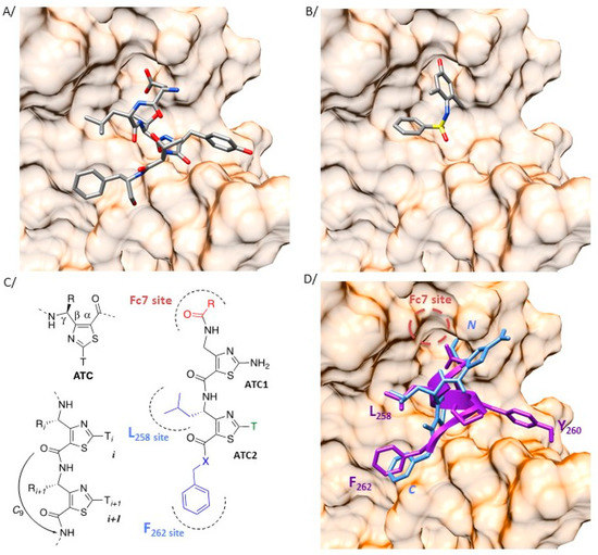 One major interest of our group concerns the design of new highly predictable and stable molecular pseudo-peptide architectures for therapeutic applications [32]. In such a context, we described a class of constrained heterocyclic γ-amino acids built around a thiazole ring, named ATCs (Figure 2C) [27]. ATC oligomers are helical molecules resulting from the planar conformation of the γ-β-α-C(O) torsion angle given by the thiazole heterocycle (Figure 2C) and the formation of a highly stable C9 hydrogen-bonding pattern. Noteworthy, it was recognized that only two residues were necessary to initiate the C9 pseudo-cycles folding. Based on 3D superimposition of a canonical γ-dipeptide model and of the 257-DLTYTF-262 peptide from GRP1 (pdb 2R09), we established that the ATC scaffold might deliver side chain projections in suitable positions to mimic the key interacting elements of the autoinhibitory domain (Figure 2D). For instance, the isopropyl lateral chain at the γ-position of ATC2 aims to mimic the L258 residue of the autoinhibitory peptide and the C-term benzyl group is superimposed to the F262 amino acid. The N-terminus extremity is matching with the Fc7 binding site (Figure 2B) [24].