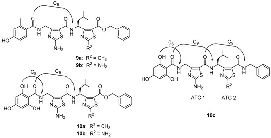 The folding propensity of 9a, 9b, 10a, 10b, and 10c was studied by NMR in CD3OH (Supplementary Information) as illustrated in Figure 3. In the case of 9a,b, de-shielding effects were observed for the ATC 2 amide protons (δ = 9.28 to 9.52 ppm depending on the molecule). As previously observed on other ATC oligomers [29,34], such a behavior is a strong indicator of the participation of the amide protons in a C9 hydrogen-bond. By contrast, the signal of ATC1 NH was around 8.5 ppm in line to what is expected for a free NH. In the case of 10a–c, both ATC 1 and ATC2 NH were strongly de-shielded (δ = 9.72 to 9.95 ppm depending on the molecule) suggesting that they were all engaged in the H-bond. While such effect was expected for the ATC2 NH, it was not usual for the N-terminus amide proton. It is likely that the NH is bonded to one OH of the trihydroxyphenyl moiety making a six-member pseudocycle. Finally, it is noteworthy that the benzylamide NH in 10c is also downfield (δ = 9.86 ppm) that is consistent with a third H-bond occurring with the ATC1 C=O.