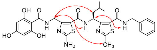 Lastly, 2D NMR experiments were performed to analyze NOE correlations (Tables S5, S8, S11, and S14, Supplementary Information). Characteristic medium γCH(1)/NH(2) connectivities were observed for all studied γ-dimers (9b, 10a, 10b, and 10c). A supplementary strong γCH(2)/NHBn connectivity was also noted. These NOE cross-peaks between NH(i)/γCH(i-1) have been recognized as structural markers of the 3D organization of ATC oligomers and corroborate the constrained structure of the dimers (Figure 4). Furthermore, two γ-dimers 10a and 10c revealed weak γCH (1)/δCH(2) connectivities, as well as weak intensity NOEs between the thiazole side chain of ATC2 and the ATC 1 γCH (γCH (1)/ϴCH(2)). These data are compatible with the previously reported C9-helical shape.