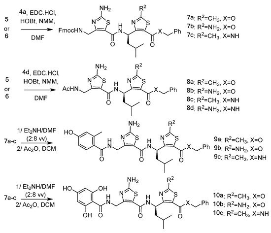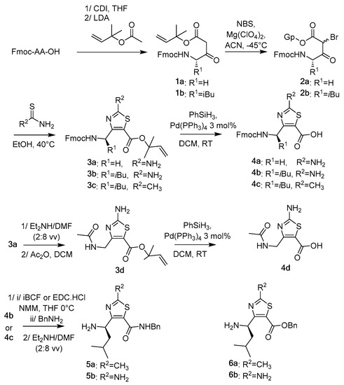 N-Fmoc-ATC-OH monomer units 4a–d were synthesized from the commercially available N-Fmoc-Gly-OH and N-Fmoc-Leu-OH following our previously reported methodology (Scheme 1). The N-Fmoc-amino acids were first engaged in a cross-Claisen condensation to lead the β-ketoesters 1a–b. The malonic position of β-ketoesters was monobrominated in acetonitrile (ACN) using N-bromosuccinimide (NBS) and magnesium perchlorate [Mg(ClO4)2] as catalyst. The resulting α-bromo-β-ketoesters 2a–b were engaged in Hantzsch heterocyclisation using thiourea or thioacetamide in EtOH to give a fully protected ATCs 3a–c. After removal of the Fmoc group of 3a with a solution of diethylamine in N,N-dimethylformamide (DMF) (2:8 v/v), the N-acetylated ATC-OH 3d was obtained using acetic anhydride. Quantitative removals of dimethylallyl esters were carried out with 3 mol% Pd(PPh3)4 and phenylsilane to yield the N-Fmoc-ATC-OH 4a–c and the N-acetyl-ATC-OH 4d. ATC-NHBn 5a and 5b were obtained in 95% and 20% from 4b and 4c, respectively using isobutyl chloroformate (IBCF, 1.2 equivalents) or N-Ethyl-N′-(3-dimethylaminopropyl)carbodiimide hydrochloride (EDC.HCl, 2 equivalents) as an activating reagent and benzylamine. Fmoc groups were removed with a solution of diethylamine in DMF (2:8 v/v). Access to N-Fmoc-ATC-OBn 6a,b has been done according to procedures reported by L. Mathieu [27].