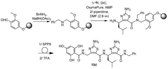 Solid phase peptide synthesis (SPPS) was also considered as an alternative strategy (Scheme 3). The acid sensitive methoxybenzaldehyde (AMEBA) polystyrene resin (0.86 mmol·g−1) was used as solid support [33]. Reductive amination using 2.0 equivalents of benzylamine and NaBH(OAc)3 gave the corresponding amine resin. Oligomerization was then performed using a mixture of ethyl (hydroxyimino) cyanoacetate (oxyma Pure®, 2.0 equivalents), and N,N′-diisopropylcarbodiimide (DIC, 2.0 equivalents) as coupling reagents in N-methyl-2-pyrrolidone (NMP) overnight followed by Fmoc removal using a solution of piperidine in DMF (2:8 v/v) [29]. After N-acylation using 2,4,6-trihydroxybenzoic acid (3 equivalents), EDC.HCl (3 equivalents), NMM (3 equivalents), HOBt (3 equivalents), the targeted dimer 10d was recovered in 10% yield after cleavage with TFA and purification on preparative RP-HPLC.
