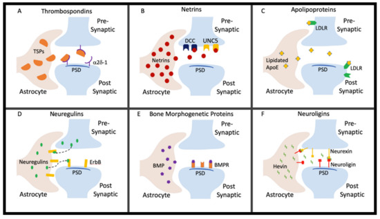 Astrocytes secrete factors that regulate extracellular matrix protein signaling, formation and maintenance of the blood-brain barrier (BBB), axonal growth, homeostasis of the synaptic microenvironment, synaptogenesis, and the promotion of synaptic diversity. (A) Thrombospondins bind to the neuronal receptor α2δ-1 at the postsynaptic density to form a silent synapse. (B) Netrins bind to multiple receptors on the presynaptic terminus such as Deleted in Colorectal Cancer (DCC) and UNC-5. (C) Apolipoproteins containing cholesterol and lipids are secreted from the astrocyte and bind to the receptors on the presynaptic and postsynaptic shafts. (D) Neuregulins are secreted by the presynaptic terminus and, in higher concentrations, astrocytes. Neuregulins secreted by the presynaptic terminus bind to ErbB receptors on the astrocyte, while neuregulins secreted by astrocytes bind to ErbB receptors on the postsynaptic terminus. (E) Bone morphogenetic proteins are secreted by astrocytes and bind to bone morphogenetic protein receptors (BMPRs) at the postsynaptic density. (F) Neuroligins located postsynaptically and on astrocytes bind neurexins on the presynaptic terminus directly and indirectly. Incompatible proteins are bridged by astrocyte-secreted hevin to stabilize the synapse.