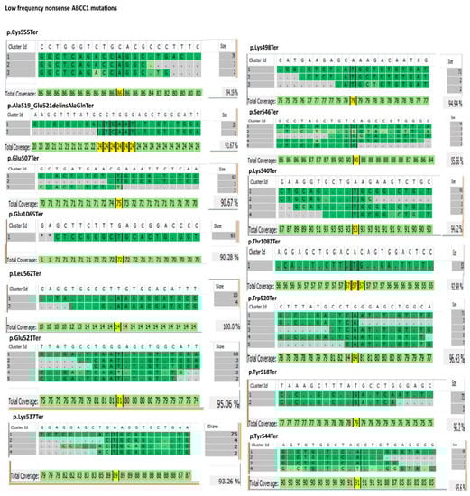 Low-frequency nonsense ABCC1 mutation sequence reads and the corresponding alignments. Reference genome sequence (gray) is on top of each screenshot. Sequence reads from the tumor biopsy with different clusters are labeled in green. Read numbers of each cluster sequence for that region are shown on the right side of each screenshot. On the bottom right side, the coverage percentage for the shown cluster reads is depicted for that region. One patient for each mutation was selected for visualization.