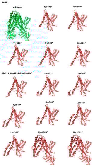 Low-frequency ABCC1 nonsense mutation caused truncated MRP1 protein structures. A structural comparison of each low-frequency nonsense mutant with the wild-type MRP1 structure is visualized in Figure 2.