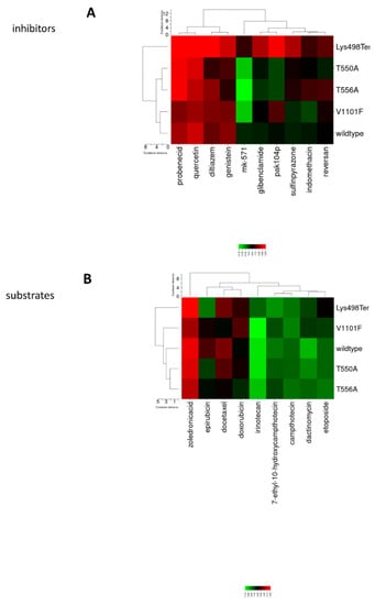 Heat maps for the docking analyses of (A) MRP1 inhibitors, (B) MRP1 substrates (green color: strong interaction; red color: weak interaction) on wild-type and mutant MRP1.