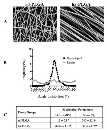 Structural and mechanical characteristics of electrospun poly(lactide-co-glycolide) (PLGA) microfibers. (A) SEM micrographs of the electrospun PLGA random-oriented (rd-PLGA) and highly aligned (ha-PLGA) fibers showing defect free fleeces (n = 3 for each type of fleece). Scale bars = 10 µm. (B) Frequency distribution of fiber orientation within PLGA fleeces with randomly distributed or highly aligned fibers. By increasing the rotational speed of the rotator collector, fibers become parallel, showing a sharp Gaussian curve where their orientation is mainly ranging within an angle from −10° to +10° differently to that of the fibers with random distribution with angles ranging from −45° to + 45; (n = 3 for each type of fleece). (C) Mechanical tests: stress (MPa) and strain (%) carried out on rd-PLGA and ha-PLGA fleeces (n = 5 for each type of fleece, scaffold dimension: 50 mm × 15 mm). Electrospun ha-PLGA fleeces possess higher mechanical properties compared to those for rd-PLGA. * Statistically significant values between rd-PLGA and ha-PLGA fleeces (p < 0.05).