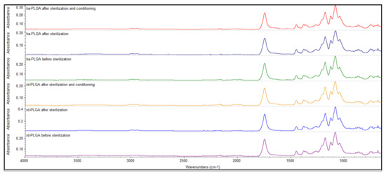 In detail, Figure 2 shows the main bands in the spectrum of tested PLGA fleeces. Before sterilization, a strong ester carbonyl stretch (C=O) absorption band at 1748 cm−1, an ether group stretching (C–O–C) at 1085 cm−1 and methyl stretching (C–H) and (C–CH3) groups at 1452 and 1044 cm−1, respectively, could be detected, characterizing the PLGA material. These same bands could be also observed in the spectra corresponding to the PLGA fleeces obtained after sterilization and after sterilization and conditioning in the GM without any switch or modification of the wave numbers.