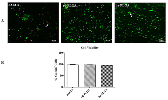 Amniotic Epithelial Stem Cell (AEC) viability on PLGA fleeces. (A) Representative images assessing oAEC survival with Calcein AM/propidium iodide (PI) stains (green and red fluorescence, respectively). White arrows indicate positive cells to PI. Scale bars = 20 μm (B) Histogram showing oAEC viability of standardly cultivated cells on a Petri dish (oAECs) and on rd-PLGA or ha-PLGA fleeces after 48 h culture. No statistical difference was evident among the three groups (p > 0.05); (n = 3 for each type of fleece/time point, scaffold size: 15 mm × 7 mm).