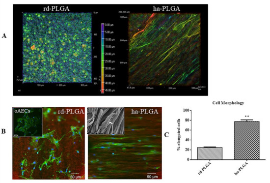 Actin staining with phalloidin, in combination with the background information of the PLGA fleeces, shows very clearly that the cells were strongly influenced in their morphology and in the alignment of the actin fibers by the structure of the electrospun fleeces. In particular, phalloidin stain (green fluorescence) allowed us to verify that oAECs seeded on rd-PLGA fleeces (CTR) retained their typical polyhedral morphology and ovoid nuclei and presented a random distribution according to the topography of the fibers (Figure 4B). In contrast, on ha-PLGA fleeces, oAECs acquired an elongated morphology, tenocyte-like, and aligned along the parallel-distributed fibers (Figure 4B). On these samples, alignment of the cell nuclei was also apparent in DAPI staining (blue fluorescence), as they became more uniformly oriented in the direction of the ha-PLGA fibers (Figure 4B). These observations were also assessed by the SEM analysis that clearly shows cell adhesion and morphological modifications due to the cell-material interaction. Cells acquired a fibroblastic-like morphology and the reduction of their cytoplasmic extensions demonstrate that they have well adapted to the fleece and that the cells have differentiated (inset in Figure 4B), further confirming the effect of matrix guidance on cell morphology and biology. After just 48 h culture, the percentage of oAECs with an elongated morphology was significantly higher in ha-PLGA (~80%) fleeces than in rd-PLGA fleeces (p < 0.01; Figure 4C).