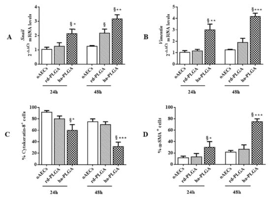 Since oAECs lost their cobblestone morphology and almost all became elongated in 48 h, it was verified if an EMT process occurred in these stem cells by analyzing their genotypic and phenotypic profile. In particular, the expression of the mRNAs of the EMT-transcription factor Snail and of the mesenchymal marker Vimentin were analyzed by RT-qPCR. As shown in Figure 6 Snail and Vimentin mRNA expressions were analyzed at 24 and 48 h of oAEC culture on both type of fleeces and on a Petri dish, as a control. Snail gene expression was significantly upregulated early at 24 h in oAEC-ha-PLGA with respect to oAEC-rd-PLGA and oAECs (Figure 6A; p < 0.01 and p < 0.001, respectively). Snail significantly increased further at 48 h compared to cells cultured alone or onto rd-PLGA bio-hybrid fleeces (Figure 6A; p < 0.05). In turn, Vimentin mRNA expression significantly and progressively increased in oAEC-ha-PLGA compared to rd-PLGA bio-hybrid fleeces (Figure 6B; p < 0.01 at 24 h and; p < 0.001 at 48 h) and with respect to oAECs at both time points (p < 0.001).