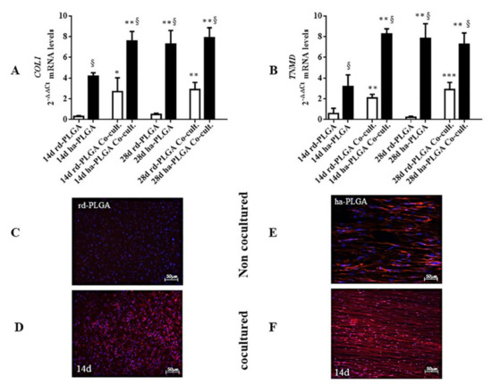 Immunofluorescent staining showed that the protein expression of COL1 was nearly non-detectable after 14 days of culture in oAECs seeded on rd-PLGA fleeces (Figure 8C). On the contrary, a minimal COL1 expression was detected in the co-cultured rd-PLGA-oAEC bio-hybrid (Figure 8D). Protein expression was detected in both normally and co-cultured ha-PLGA-oAEC bio-hybrid groups already after a 14-day culture (Figure 8E,F), but in the co-cultured one the immunostaining resembled the ECM architecture of native tendon tissues already at day 14 of culture (Figure 8F), whereas in the normally cultured ha-PLGA-oAEC bio-hybrid after 28-day culture (Figure 7C), showing also with this the technique an anticipated process of cell differentiation.