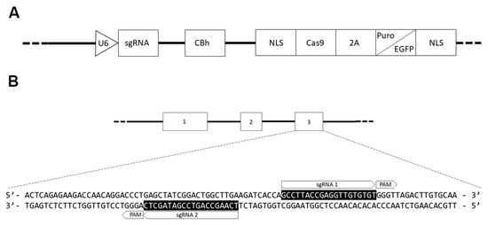 (A) The two plasmids have the same structure except for the sgRNAs, which are designed to be complementary to the exon 3 of PLAUR gene (B), and the markers bearing Puromycin resistance and the Enhanced-GFP. Such plasmids were tested and verified by the manufacturer.
