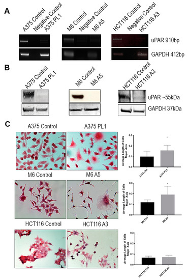 We transfected melanoma and colon cancer cells with two CRISPR/Cas9 D10A plasmids, each one bearing a specific sgRNA, as shown in Figure 1A, designed by the manufacturer to generate a double strand break in uPAR exon 3 (Figure 1B), thus obtaining a complete PLAUR gene knockout. The use of two sgRNA and the mutant version of the Cas9 enzyme will lead to the reduction of unwanted off-target effects, albeit reducing the efficiency as well [24]. We selected uPAR KO cells and exploited the positivity for the GFP marker by Fluorescence-Activated Cell Sorting (FACS) and culturing them with puromycin for 2–3 weeks. The pools of KO cells were diluted limitingly to obtain single clones that were subsequently evaluated for uPAR mRNA expression by qPCR, selecting only the clones with an expression under 0.15-fold of PLAUR (Supplementary Figure S1). Individual clones were then screened by WB for uPAR expression, and from this selection, we obtained one uPAR KO clone from A375p, called hereafter A375 PL1, and one from A375M6 called M6 A5. A375p and A375M6 Control were transfected instead with a plasmid containing a scramble sgRNA. As further internal control, and to avoid tissue specific effects of uPAR deprivation, we decided to also introduce another uPAR KO clone obtained, as described above, from a completely different tissue, the colon carcinoma HCT116 cell line, referred to from now on as HCT116 A3. We evaluated the success of transfection with RT-PCR and WB (Figure 2A,B). We immediately noticed deep morphological changes, as uPAR KO clones showed larger dimension and different shapes, with respect to the cells transfected with the Control Plasmid (Figure 2C). Analyzing the cells dimension, we observed that while A375 PL1 and M6 A5 showed a larger dimension, HCT116 A3 did not increase its average length. However, when also evaluating the cellular complexity by FACS analysis, we evidenced a higher internal complexity in all uPAR KO clones (Supplementary Figure S2).