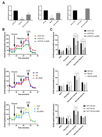 (A) Total RNA isolated was subjected to quantitative PCR (qPCR) analysis of PLAUR expression. Data are presented as mean ± SD. ** p < 0.01; *** p < 0.001 (One-way ANOVA test) (n = 3). (B) The Glycostress assay was performed as described in “Results.” The ExtraCellular Acidification Rate (ECAR) (C) measured in Seahorse Glycostress assays is shown as traces from a representative Seahorse run. (B) The average of the three measures after the exposure to the above described drugs is summarized in histograms. Here are the summarized results from at least three independent biological experiments, each consisting of independent cell plating on five Seahorse microplate wells. Data are presented as mean ± SD. * p < 0.05; ** p < 0.01; *** p < 0.001 relative to Control (One-way ANOVA test).