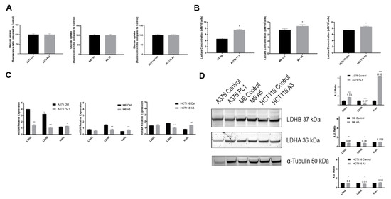 (A) Quantification of the fluorescence probe (2-NBDG) uptake through flow cytometer analysis (n = 3). (B) Lactate production in conditioned media collected after 24 h (n = 5). (C) Total RNA isolated was subjected to qPCR analysis of LDHA and LDHB expression. The ratio represents the LDHA/LDHB expression (n = 3). (D) Immunoblot analysis of total cell lysates in order to determine the expression levels of LDHA and LDHB. Expression levels were checked by loading equal amounts of total protein. Densitometry analysis was performed using ImageJ software (n = 3). Data are presented as mean ± SD. * p < 0.05; ** p < 0.01; *** p < 0.001 (Student’s test).