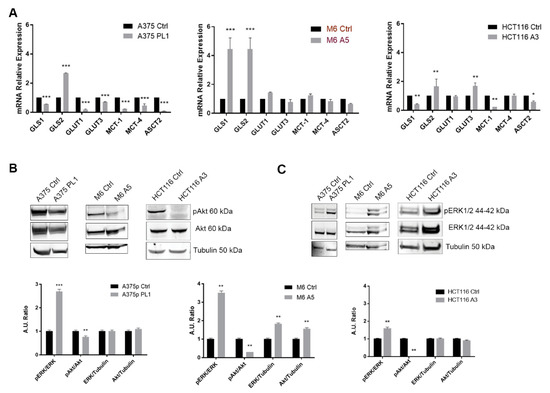 To better understand how uPAR KO may so deeply affect the melanoma and colon carcinoma cells metabolism, we decided to evaluate the glutamine, lactate and glucose transporters. Indeed, glutamine is reported to be a fundamental metabolite, fueling the pool of several intermediate metabolites. For this reason, we decided to check the expression levels of the glutaminases 1 and 2 enzyme as well. As shown in Figure 5, after uPAR KO, there was a downregulation in A375p and the HCT116 clones of the lactate importer gene MCT-1, which is one of the main genes responsible for the modulation of the cellular levels of lactate and pyruvate, while the expression level of the lactate exporter, MCT-4, was downregulated only for A375, although we did not observe any changes in the other two cell lines. GLUT1 (SLC2A1) and GLUT3 (SLC2A3) expression levels, as well as GLS1, were discordant among the clones, while we reported the higher Glutaminases 2 (GLS2) expression in all uPAR KO cells that might fuel the intracellular pool of the Krebs cycle intermediate. Last, we observed a downregulation of ASCT2 (SLC1A5) expression in A375 and HCT116 KO clones, while in M6 A5, the variation was not statistically significant. Playing uPAR, an important role for several cellular functions triggering the PI3K/Akt pathway through many membrane receptor partners, we decided to analyze the phosphorylation level of Akt and ERK. We verified that in the absence of uPAR, Akt was significantly less phosphorylated while ERK, to compensate such effect, was strongly phosphorylated. Such changes in the phosphorylation pattern may reflect the deep metabolic alterations observed here.